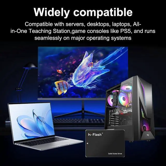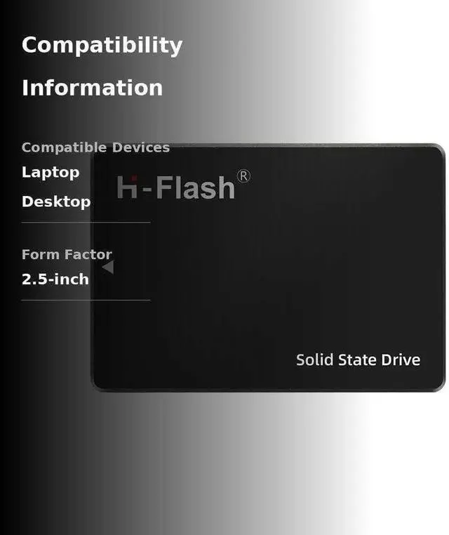 Upgrade Any System Effortlessly with This Versatile 2.5 Inch SATA SSD, Designed as a Reliable SSD for Laptop and PC Upgrades. ^^ Ample Storage Options Including 256GB, SSD 480GB, and 1TB Capacities to Meet All Your Data Needs. Perfect for Storing Games, Apps, and Media, This High-Capacity 1TB SATA SSD Ensures You Never Run Out of Space. ^^ Built for Durability and Long-Term Reliability with Shock-Resistant Flash Memory. Keep Your Data Secure with the Robust H-Flash 2.5 SSD Hard Drive, a Trustworthy SSD for Laptop and Desktop Systems That Offers Peace of Mind.