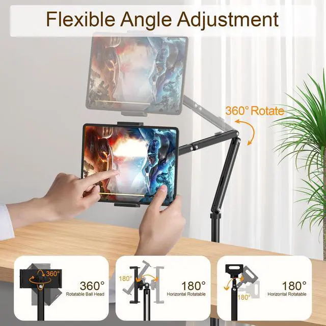 Adjustable Height & Viewing Angles: Easily adjust the stand's height and tilt the head to 360 degree angles, providing the perfect comfortable viewing position for your tablet whether you're standing, sitting on a couch, or in bed. ^^