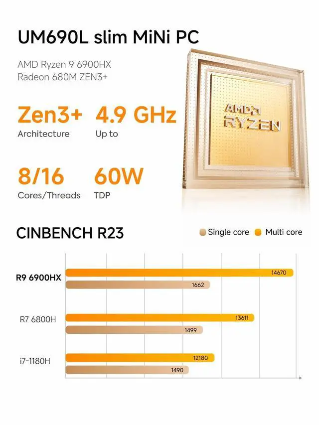 Powerful CPU PerformanceThe UM690L Slim Mini Computer is equipped with an AMD Ryzen 9 6900HX processor with 8 cores and 16 threads (Zen 3+ architecture, maximum core frequency 4.9 GHz, 16 MB L3 cache), offering excellent multitasking capabilities and high performance. Whether complex computing tasks or intensive gaming, it handles them with ease. ^^ High-performance graphics cardEquipped with an integrated AMD Radeon 680M graphics card, which supports high-resolution image output and a high refresh rate. With HDMI 2.1, DP 1.4, and USB 4 interfaces, it supports the simultaneous connection of three 4K monitors to meet business and entertainment needs.