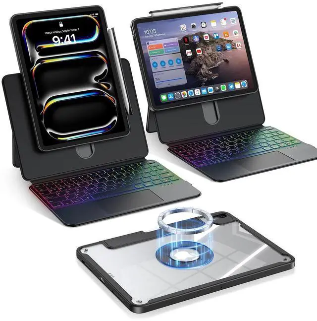 Back Case: it delivers full protection when attached (ideal for on-the-go use), and transforms into a magnetic transparent shell once removedshowcasing your iPads original look without hiding its design. The shells strong magnet lets it stick to surfaces like fridges, making it easy to watch videos while cooking, or to gym machines for hands-free workout guidance ^^ 360 Magnetic Rotation -