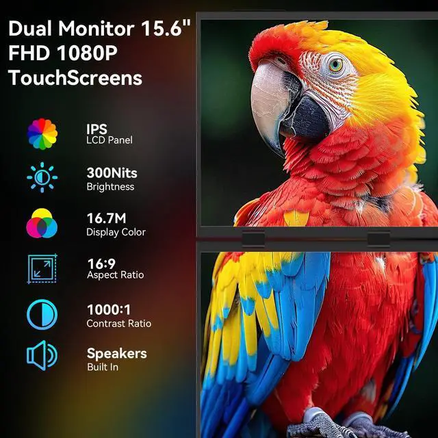 Folding Monitor: The 15.6 -inch dual-screen touch monitor features an HDR 1080P IPS panel with 360 foldable rotation. It delivers a 60Hz refresh rate, 72% sRGB color gamut, 16:9 aspect ratio, 300 nits brightness, and 1000:1 contrast ratio for stunning visuals and a more comfortable viewing experience. Built-in dual speakers and a 180 adjustable stand, compatible with 75x75mm VESA mounts, enable flexible placement of the dual-screen portable monitor for ultimate convenience.
