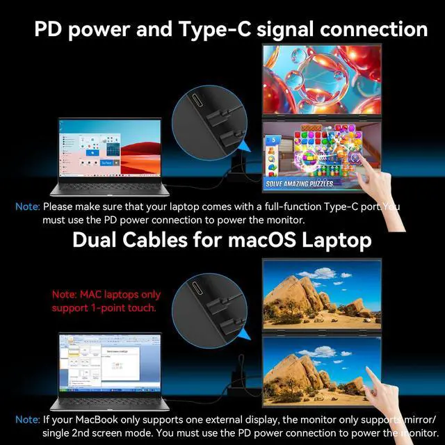 Dual Screen Portable Monitor: The 15.6" dual screen portable monitor supports up to 10-point multi-touch. Simply tap the LCD screen with your fingers to perform intuitive actions like zooming, clicking, and dragging.