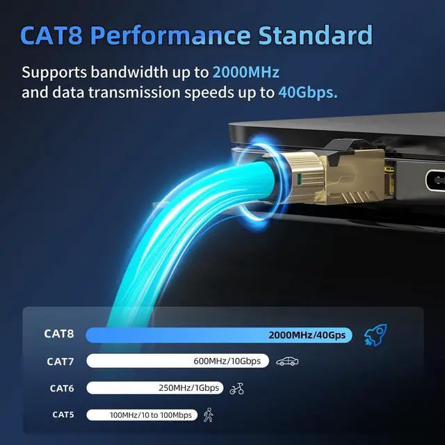 ULTIMATE SPEED & BANDWIDTH: Experience the pinnacle of networking with our Cat8 5 ft Ethernet cable. Delivers blistering speeds up to 40Gbps and a massive bandwidth of 2000MHz over distances up to 30 meters. Perfect for transferring massive files, powering smart homes, and building a future-proof network infrastructure that will serve you for years to come.