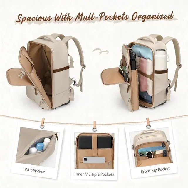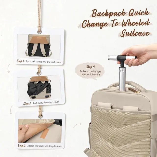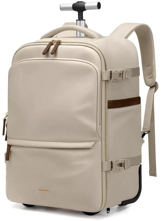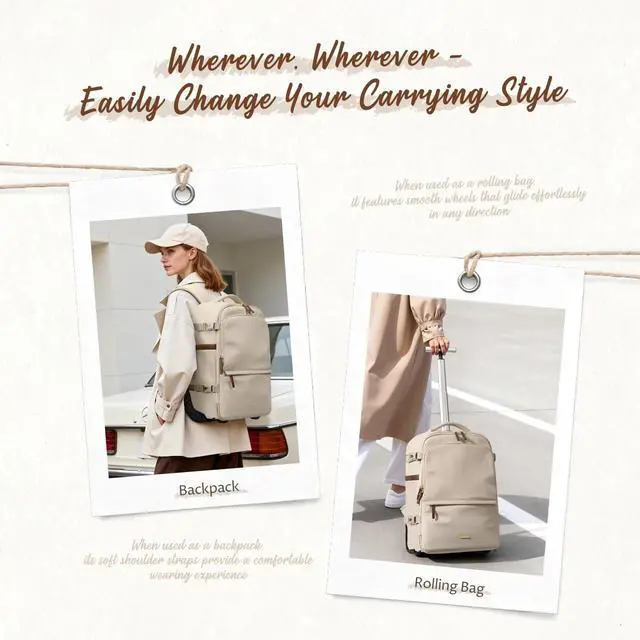Convertible Rolling & Backpack Design - Designed for both business and travel, this rolling laptop backpack easily switches between wheeled mode and backpack mode. Hideaway padded straps and a wheel-cover panel keep your clothes clean while carrying. Perfect for airports, offices, campuses, or commuting. ^^ 32L Capacity with Multi-Compartment Organization - This 32L carry-on rolling backpack features a padded 17-inch laptop sleeve, a spacious main compartment with clothing straps, and multiple zipper pockets for documents, chargers, and travel items. Front organizer panel includes slip pockets, pen slots, and a detachable key leashideal for efficient travel and workdays.