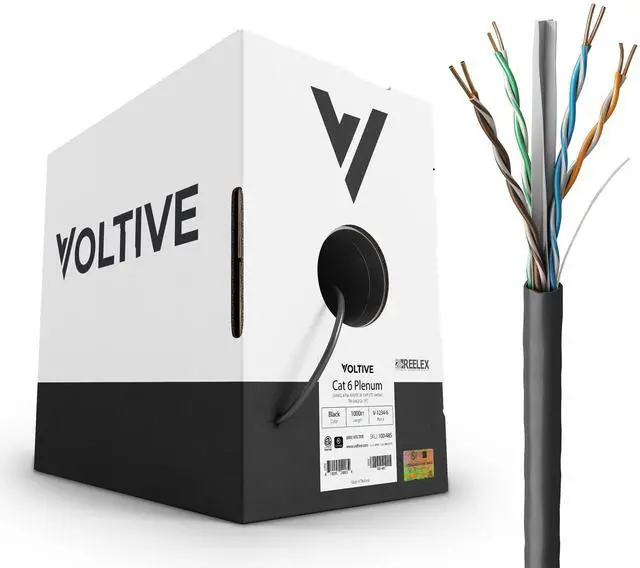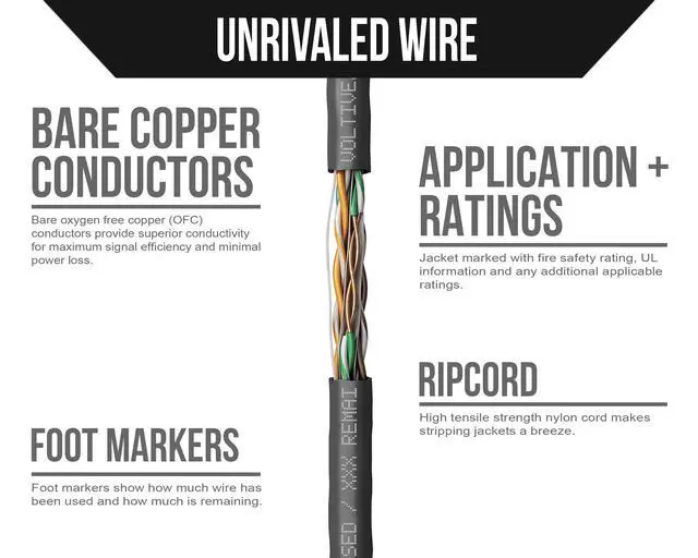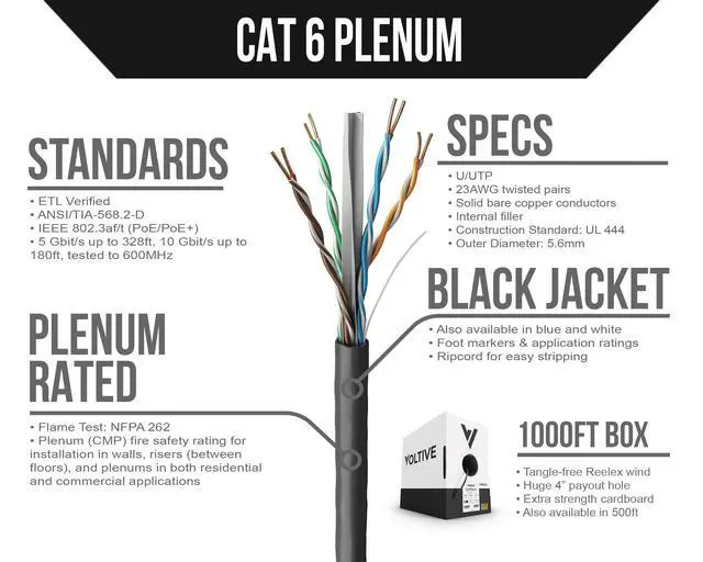 CAT 6 NETWORK CABLE. 23 gauge, 4 pair, solid copper conductors w/ spline, unshielded (UTP). 1, 2.5, and 5 Gigabit speeds up to 328ft, 10 Gigabit up to 180ft. ETL Verified. Tested to 600MHz. PoE & PoE+. ^^ OXYGEN-FREE COPPER. Oxygen-free copper (OFC) conductors result in less signal loss and are more durable than conductors made of copper-clad aluminum (CCA). ^^ PLENUM RATED. Plenum (CMP) fire safety rating for installation in walls, risers (between floors), and plenums in both residential and commercial applications.