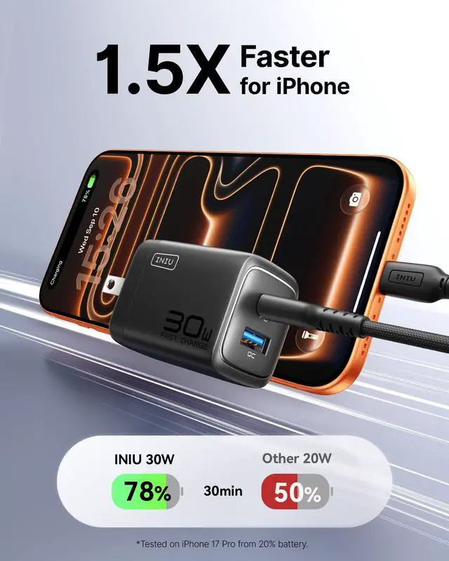 Ultra-Compact Design: It has dual ports and is 30% smaller than the original 30W charger with a foldable plug. It fits any pocket and is your perfect travel partner! ^^