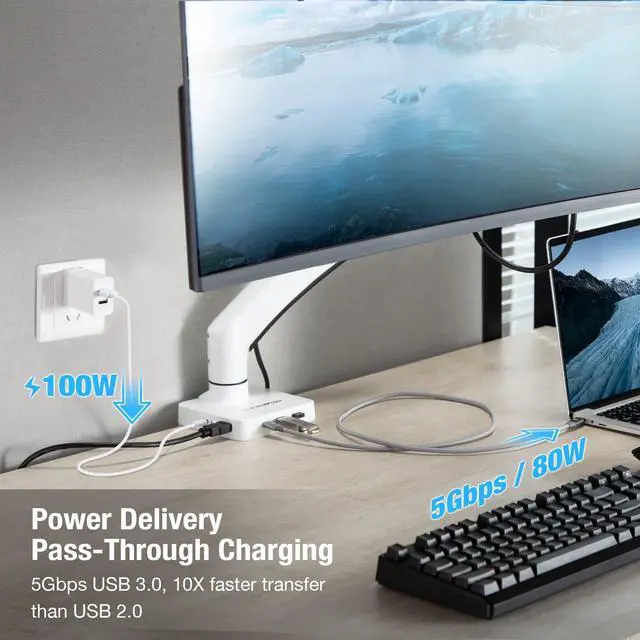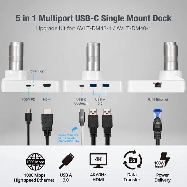 FULL-FUNCTIONED USB-C MOUNT DOCK - Upgrade kit for AVLT Single Monitor Arm (AVLT-DM42-1 / AVLT-DM40-1). Adds 2xUSB-A 3.0 (5Gbps), 1xHDMI (4K@60Hz), 1xRJ45 Ethernet (1Gbps) and 1x100W PD (max) to your single monitor arm setup. ^^ SOLID CONSTRUCTION - Robust Aluminum mounting structure to protect the hubs internal parts and supports a compatible AVLT monitor arm and monitor up to 33lbs (15kg). ^^ KEEP ALL YOUR DEVICES CONNECTED - Easily transfer power, data and video with the included high quality braided USB-C cable. Must use a supported Full-functioned USB-C 3.1 Gen 1 Port (or above) (must support transferring data, audio, video, and power.