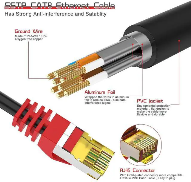 • Superior Performance & 26AWGCat8 lan cable is uses 4 pairs of individually shielded aluminum foil twisted pair (F/FTP) and single stranded OFC wire.It provides better protection from cross