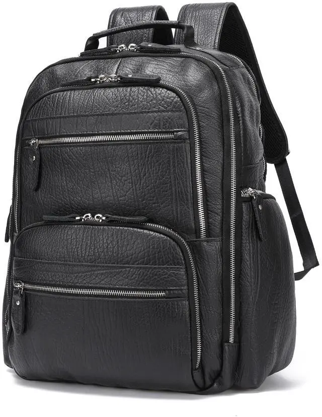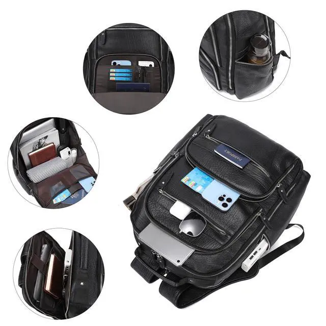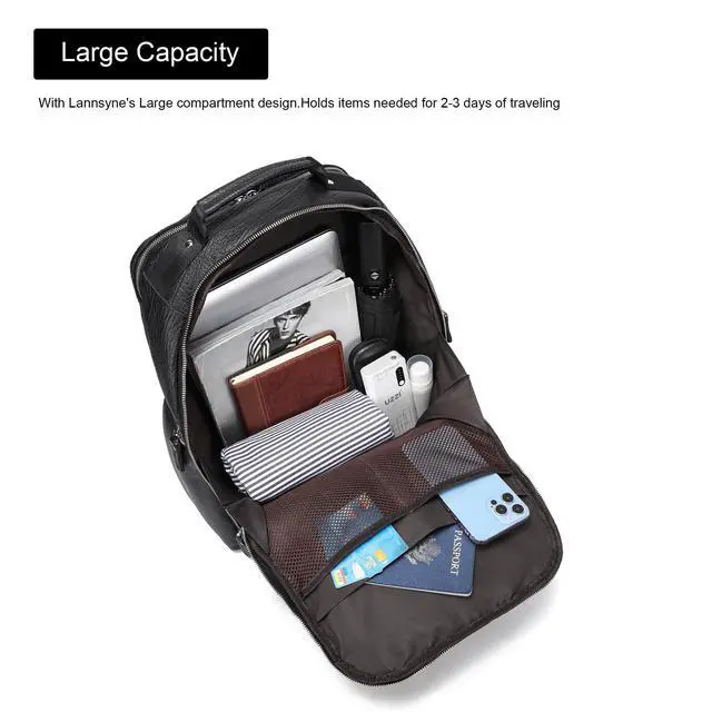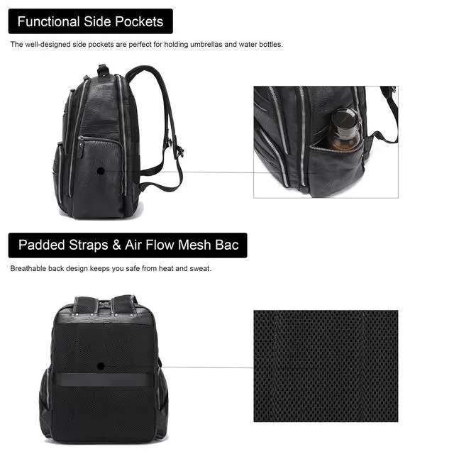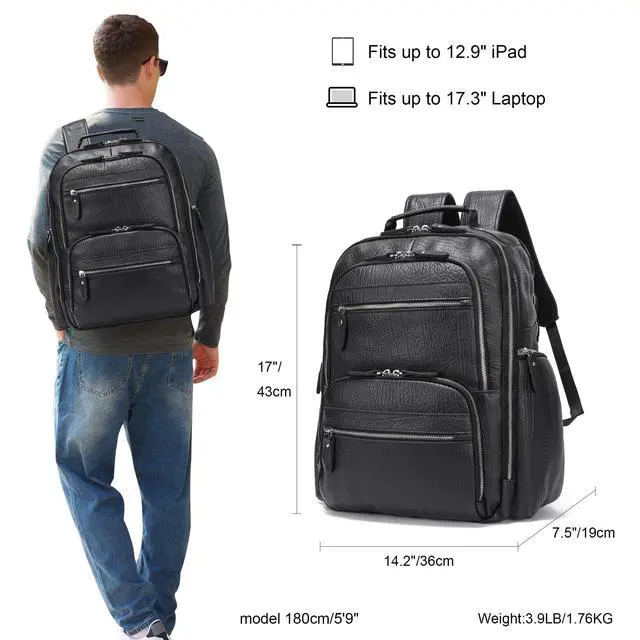 ^^ Multi-Pockets Design: The leather travel backpack for men has 30L large capacity can carry on 17.3 inch laptop, it also has 3 main compartments, 3 front zipper pockets, 2 side pockets fits water bottle/umbrella/mini iPad, 2 glasses strap and 1 luggage strap.