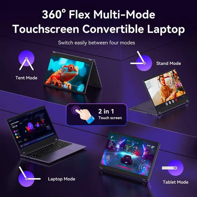 Design: Laptop, Tablet, Tent & Stand ModeOne device adapts to every situation. The innovative 360 hinge allows you to seamlessly switch between four versatile modes: use it as a traditional Laptop for typing, flip it to Tablet mode for drawing and browsing, set it in Tent mode for sharing videos, or position it as a Stand for comfortable video calls. Unleash your creativity and productivity in the way that suits you best. ^^ 15.6" FHD Touchscreen & Powerful 8GB RAM + 256GB SSDInteract intuitively and work efficiently. The vibrant 15.6 -inch office laptop with Full HD touchscreen puts control at your fingertipsperfect for sketching, navigating, or playing games. Under the hood, the substantial 8GB RAM ensures smooth multitasking across apps and browser tabs, while the speedy 256GB SSD offers ample space for all your projects, movies, and music, with faster boot times and file access. ^^ Efficient Performance for Daily Tasks & Stylish Deep Purple DesignPowered for your everyday adventures. The Intel m3-8100Y processor delivers reliable performance for online classes, web browsing, document editing, and streaming. Housed in a sleek and unique Deep Purple chassis, this 2-in-1 business laptops doesn't just work wellit stands out with a bold, modern aesthetic that reflects your personal style.