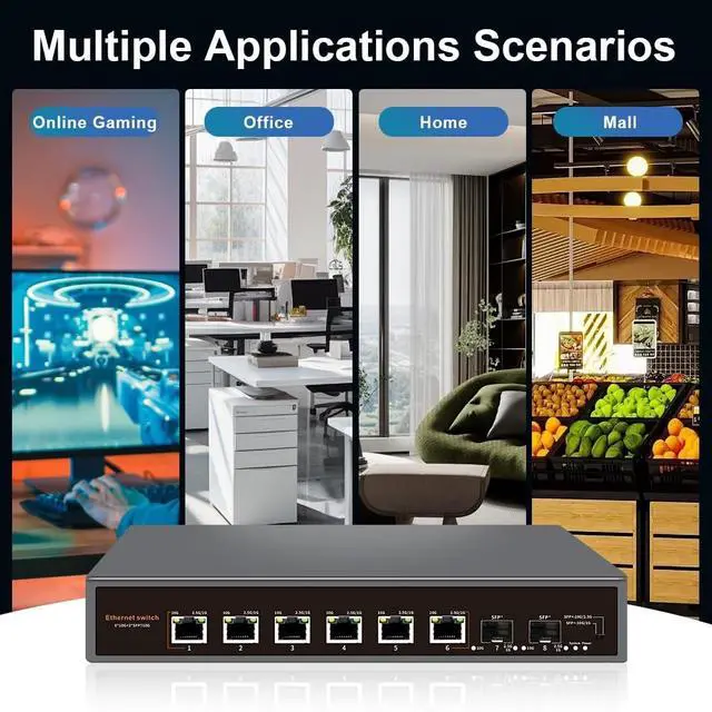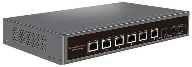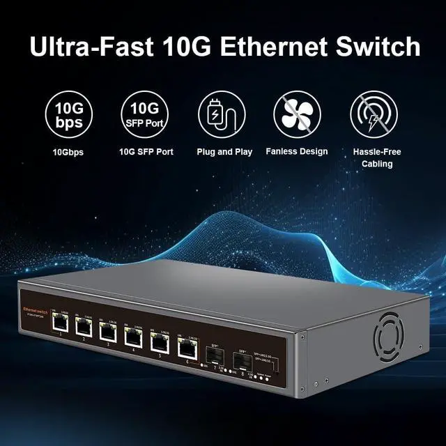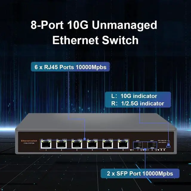 10G Unmanaged Ethernet Switch: Including 6*10G Base-T Ports and 2*10G SFP Uplink Port, compatible with1000M/2.5G/5G/10G, equipped with 80Gbps switching capacity.