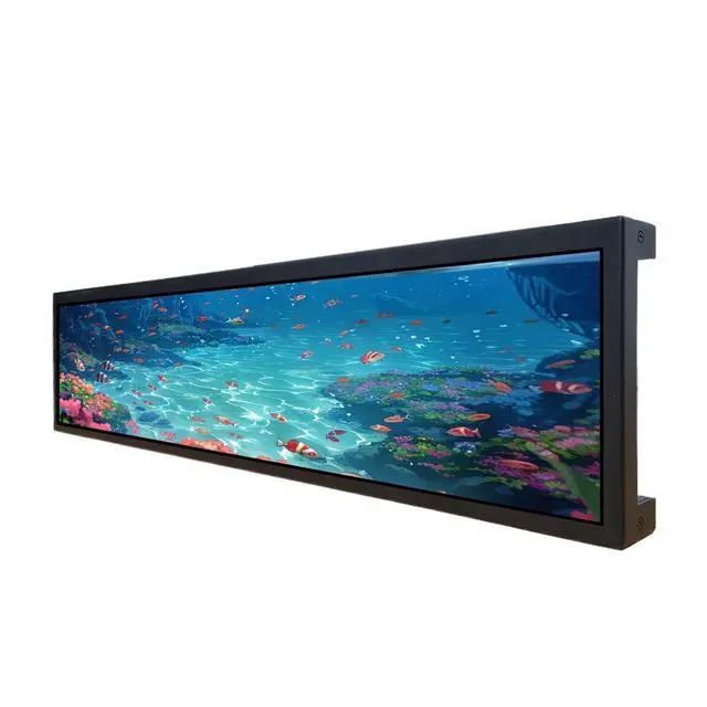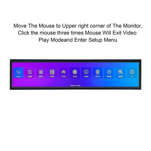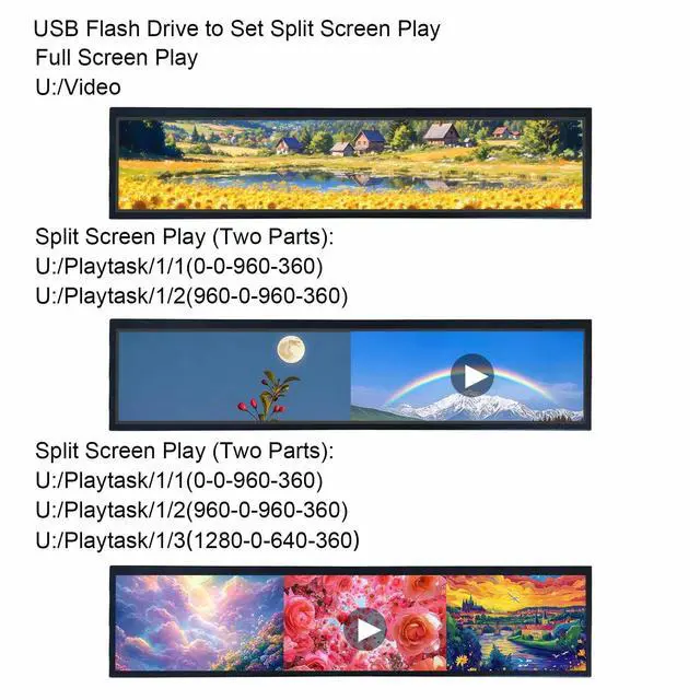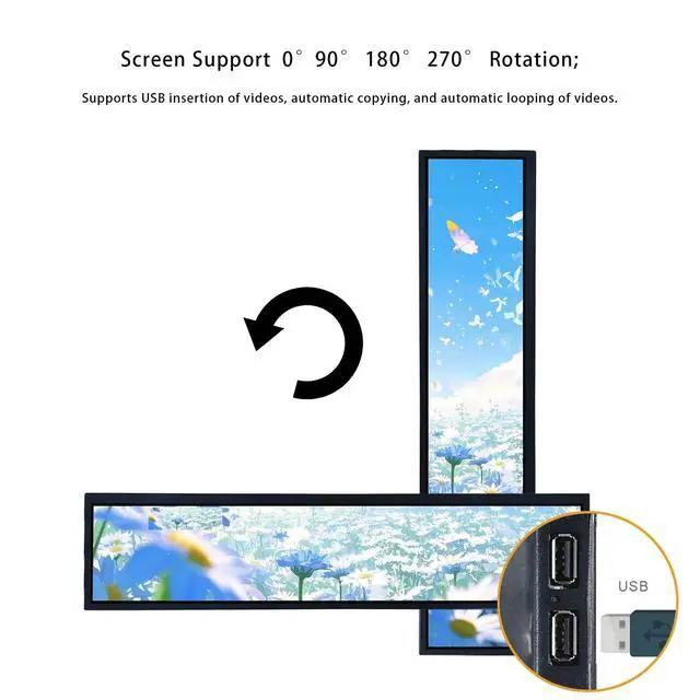 21.3" IPS Bar Display1920x360 high resolution, 500 cd/m brightness, 1200:1 contrast ratio, and 178 viewing angles for clear visibility ^^ USB Auto-Copy and Playback Two USB 2.0 ports allow for automatic copying and continuous looping of images and videos from a USB drive without a computer ^^ FeatureSupports image rotation at 0, 90, 180, and 270 degrees for flexible landscape or portrait orientation. And supports split screen, allowing you to divide the screen into multiple sections. You can simultaneously play a combination of videos, images, and audio from a single USB drive, creating dynamic and informative multimedia presentation ^^ Multiple Mounting OptionsCan be installed using the included brackets or a standard vesa wall mount ^^ Commercial ApplicationsDesigned for use as a digital signage display in elevators, retail stores, restaurants, supermarkets, and for product promotion