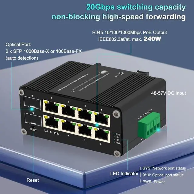 ConstraintPlease Attention: This Din Rail Ethernet Switch dont contain Power Supply, You need to purchase separately. 48V/240W recommended (Determined by the total power of your devices)