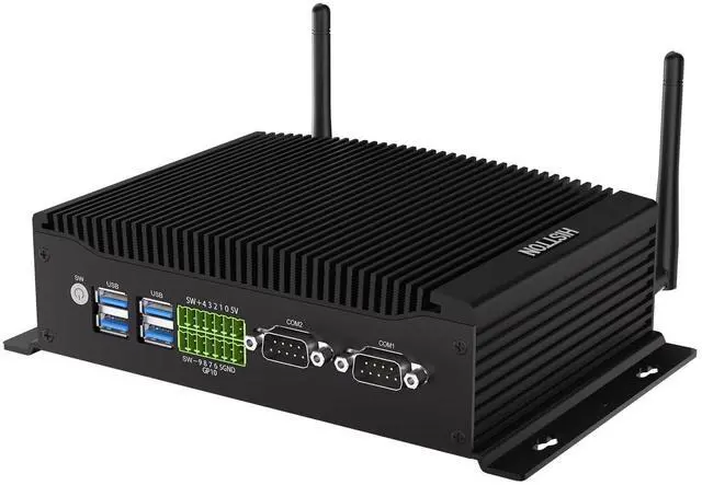 And 4*USB 3.0 ports, 2*HD ports, 1*DP port, and 2* RS232/RS485 COM, 1*14 Pin GPIO, 1*SPK, 1* MIC, thus offering the user even greater versatility in use. ^^ Fanless Cooling Design & Energy SavingThis mini computer featured by noise-free, fanless design and brushed aluminum shell has excellent durability and heat dissipation, say goodbye to the worry of heat dissipation, compared with the consumption of 150W traditional computers, it helps to save more than 80% of energy for its DC12V 5A power supply and 15W-20W power consumption.