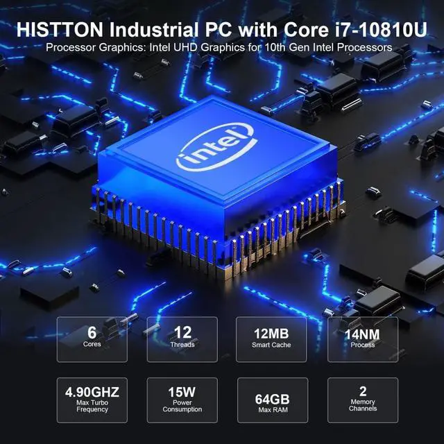 Powerful CPU & High Capacity StorageHISTTON H6 Industrial Mini PC Pre-installed Windows 11 Pro 64 bit (Windows is activated), Onboard the Core i7-10810U 14nm Processor (12M Cache, up to 4.90 GHz), 2 x DDR4 SO-DIMM Memory Slots(can upgrade to 64 GB, 2 x 32 GB), 1 x M. 2 2280 NVME PCIE 3.0 x 4 / SATA 3 SSD and 1 x 2.5 inch SATA HDD/SSD. ^^ 4K HD Triple DisplayHISTTON Fanless Mini PC uses Intel-UHD Graphics for 10th Gen Processors to support 4K HD video playback, 2x HD and 1x DP can connect 3 monitors, which increases work efficiency effectively.