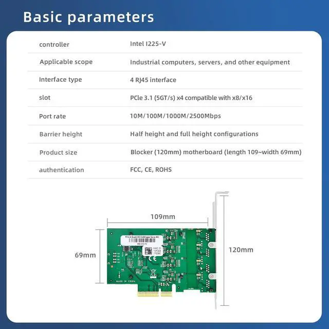 "High-Performance Chip and Power Consumption", The network card is equipped with the high-performance Intel I225-V chip. It offers outstanding performance while maintaining low power consumption, ensuring efficient network data processing with reduced energy usage. ^^ "PCI-E Bus and Port Speeds", It utilizes the PCI-E bus with PCI Express 3.1 standard, operating at 5GT/s x4 and being compatible with x8/x16. The port speeds are adaptive, ranging from 2500Mbps to 10Mbps (2500/1000/100/10Mbps), allowing it to automatically adjust to different network environments for seamless connectivity. ^^ "Network Standards and Functional Features", Supports IEEE 802.3 Ethernet interface for multiple applications like 2500BASE-T, 1000BASE-T, 100BASE-TX, and 10BASE-TE (covering 802.3, 802.3 u, 802.3 bz, and 802.3 ab).