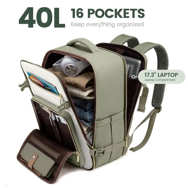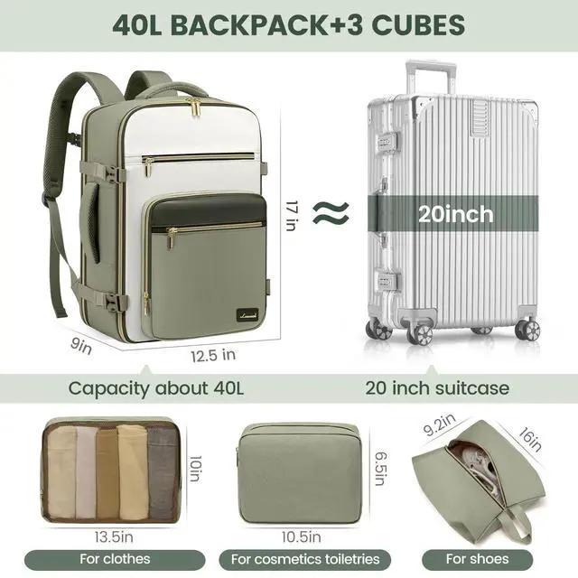 ^^ Spacious & Organized: With a capacity of 40L, 4 compartments, and multiple pockets, this travel backpack allows you to easily separate and organize your belongings. Pack 3-5 days worth of travel essentials with ease. ^^ Packing Cubes & Wet Pockets & Shoe Bag: This travel backpack comes with 3 additional storage pockets, a toiletry bag and a shoe bag and a clothing organizer bag. This ensures your products are clean and tidy.