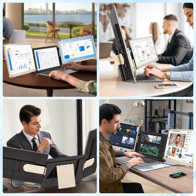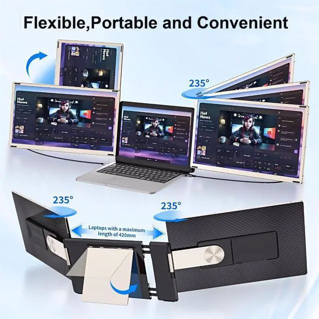 [Customize your work station]: With the new upgraded magnetic structure, this new generation laptop screen extender allows you to customize your own working/entertainment station with the extra accessories. This triple portable monitor laptop also supports 90rotation (From portrait to landscape). You can assemble the screen in any form you like or you can just use one of the screens with the extra single stand. Just let your imagination run wild and the new portable triple monitor for laptop will meet all your needs.