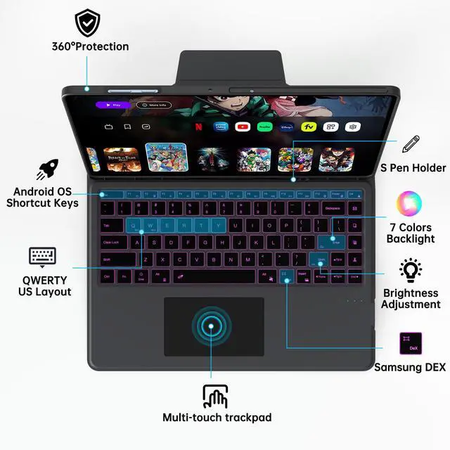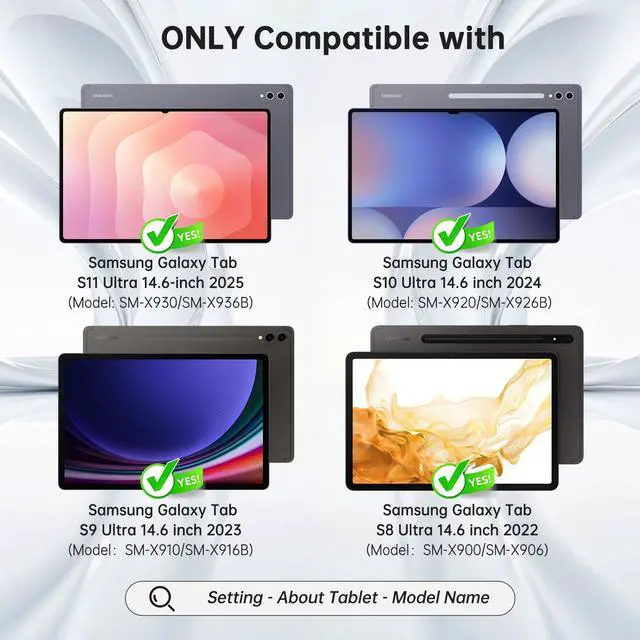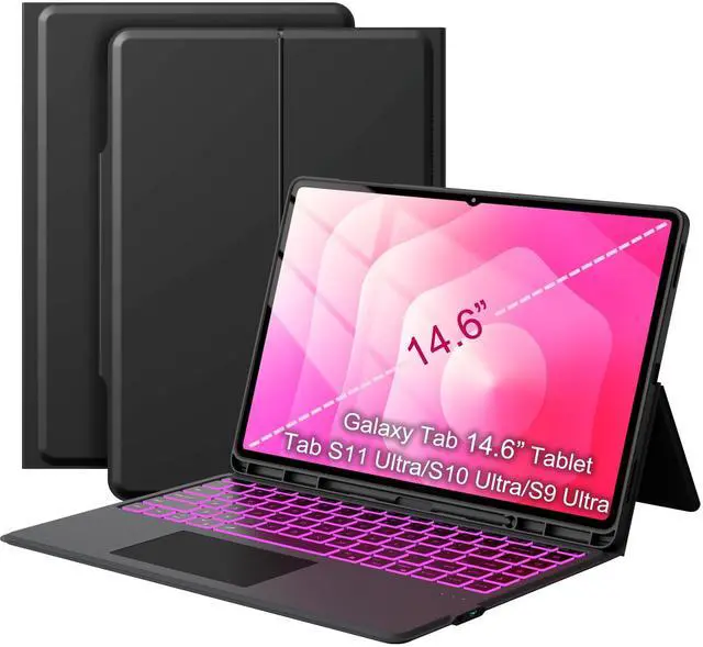 Compatibility - ONLY Compatible with 14.6" Samsung Galaxy Tab S11 Ultra 2025 (SM-X930/X936B) /Galaxy Tab S10 Ultra 14.6 inch 2024 (SM-X920/X926B/X926N/X920N)/Galaxy Tab S9 Ultra 2023 (SM-X910/X916B)/S8 Ultra 2022 (SM-X900/X906) Tablet, please kindly check your tablet model before ordering[Go to setting- about tablet - Model name to check your model; Tablet and s pen are not included ] ^^ Multi Function - The Galaxy Tab S11 Ultra Keyboard case design with a pencil slot to store your s pen, built in trackpad and backlit, allowing you to experience the pleasure of typing anytime, anywhere as a laptop, even day or night, brings a different feeling of your new Samsung Tablet, very suitable for travel, office or school use! ^^ Colorful Backlight Keyboard & Non-Detachable - This Samsung Tab S11 Ultra tablet case with keyboard designed with 7 colors backlight with 3 level brightness to adjust, make it fun and easy to type in dark or at night.