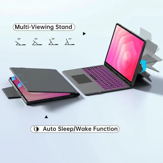 The keyboard and the leather case are in one piece design, make your tablet as a real laptop. Safe magnetic closure allows you to carry a tablet keyboard and hard shell with you. Convenient to carry, very suitable for travel and business ^^ Multi-Touch Trackpad & AI Key - QWERTY US Layout keyboard for Galaxy Tab S11 Ultra/S10 Ultra/S9 Ultra/S8 Ultra with intelligent touchpad without needing a extra mouse, supporting multi -finger function and you can accurately control and navigate, realize the combination of tablet computers and computer functions, enjoy "Laptop"experience. AI key designed help easy to control your tablet, edit documents, browse the network and build a presentation for unparalleled speed, improving work efficiency ^^ Multi-Viewing Stand & S-Pen Holder - Our Tab S11 Ultra Samsung tablet case keyboard uses leather case and combo keyboard 2 in 1 design, non-detachable, so that you can use the tablet as a real laptop computer, creating a simple and smooth typing experience; built-in rotate stand; You can adjust the screen vision and typing position according to your needs.