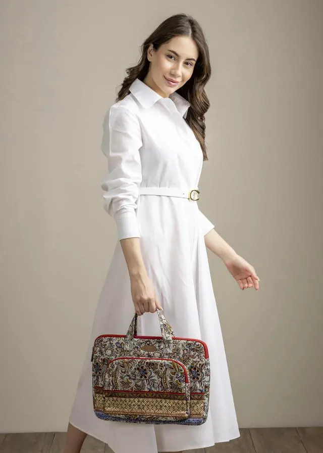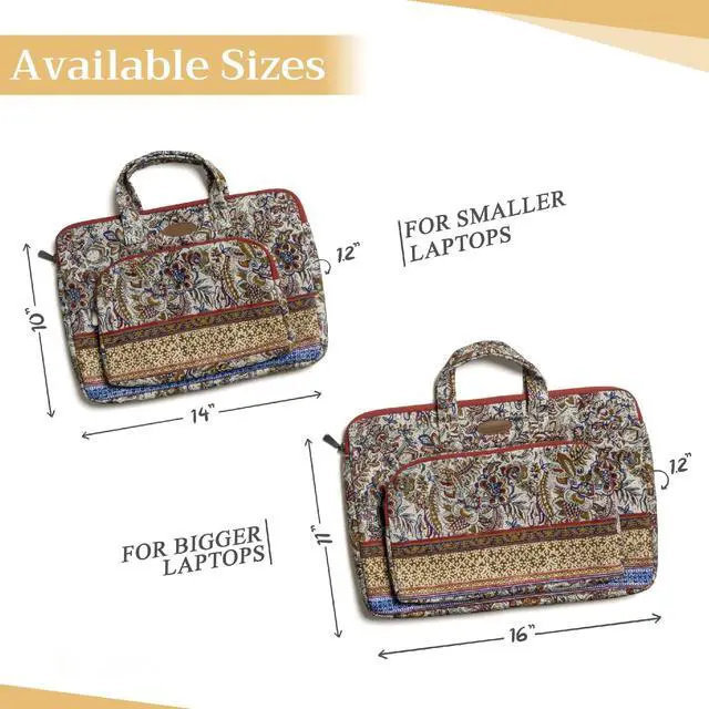 Artsy Designs and Vibrant patterns in vibrant colors provide huge visual interest, setting our bags apart. It is a versatile choice for just daily use, travel or commuting and a true delight to carry around ^^ Comes in two sizes o Small 14 Width, 10 Length, 1.2 Deep (Outer dimension) Compatible with 12- 13.3 Laptops / Ultrabooks, 13- 13.5 Laptops / Notebooks / Ultabooks. o Large 16 Width, 11 Length, 1.2 Deep (Outer dimension) Compatible with 15 Macbook air / Macbook pro, 15.3 ipad pro and most 14- 14.56 Laptops / Notebooks / Ultrabooks ^^ There is an extra removable holder on the handles.