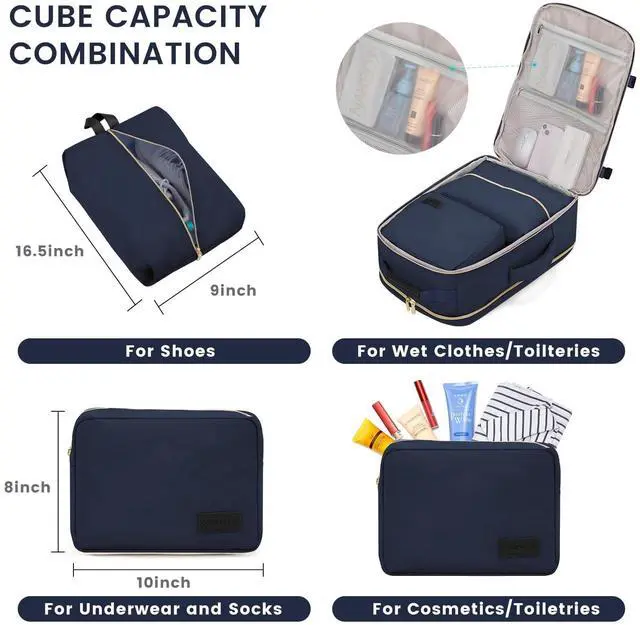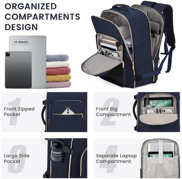 50L LARGE CAPACITYOur travel backpacks enable you to pack all your travel essentials for a 7-9 day travel, which can hold 3-7 days' clothing, a pair of shoes, your wallets, toiletries, a 17.3 '' laptop, a 12.9 '' iPad and so on. The side straps can also help you compress the pack when it is too full. ^^ WELL-DESIGNED COMPARTMENTSThis travel backpack has 4 main compartments and 3 packing cubes supplied, which enable you to keep your things in order. Your shoes, toiletries, and underwear can be placed in separate packing cubes.