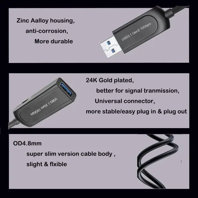 Cable construction design: OM3 Multi-mode optical fiber+copper wire, military level Kevlar inside to strengthen the pull force and flexibility. Optical Fiber to Engine build in support long distance signal transmission without signal loss. ^^ High-speed data transfer Fiber optical Active Cable Support all Operation system, including Windows, Mac OS, Linux, widely used on Industrial Camera, Machine Vision system, Medical System, Security Monitoring system, Conference system, Broad casting system etc.. High frequently used on Printer, Scanner, Touch Screen, Camera, Game Controller etc.