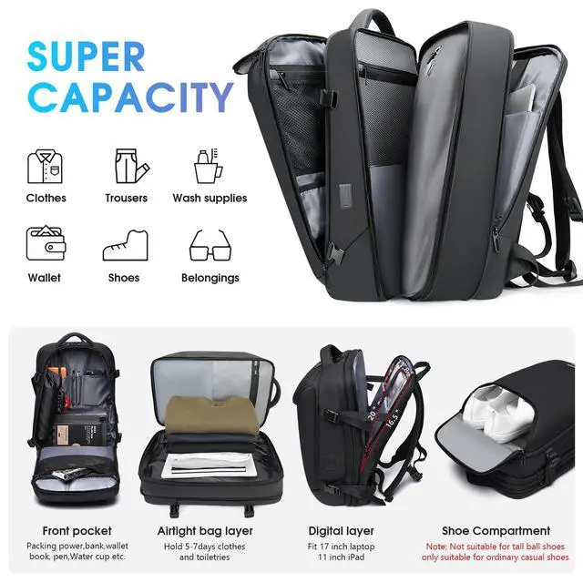 Please note: If the pump does not work, please charge it and try again. ^^ 35L-50L EXPANDABLE DESIGN This mens travel backpack can be expanded to a 50L super large capacity travel backpack, equivalent to use a 20-inch rolling suitcase. When you don't need large volume, you can zip it up and change back to 35 liters. Our suggestion is 50L backpack more suitable for tall people, recommended 5.91 feet and above. 160 pounds and above people use, more suitable for men, because the backpack is large, suitable for 5-7 days of travel. ^^ Dedicated laptop compartment50L travel backpack for men with three spacious main compartments and multiple hidden pockets. This expandable travel backpack comes with a dedicated computer compartment. Foam pads are sewn on both sides of the compartment to better protect your computer from damage and make you feel more at ease. It also features an independent shoe compartment, allowing you to separate your shoes from your clothes and block out odors. ^^ Comfortable and Durable]Travel Laptop backpack made of high-quality zipper and 900D high-density Oxford fabric, durable and waterproof. The backpack with a multi-panel airflow design and a 3D back pad, adjustable and padded shoulder straps that effectively relax your shoulders and back, ensuring comfortable and breathable.