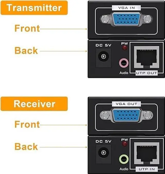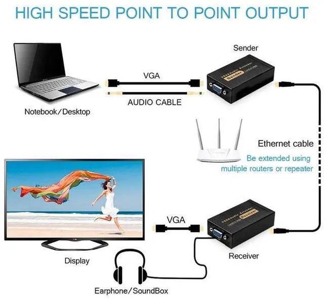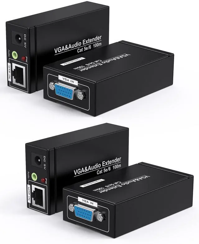 Usage: -vga over cat5e cat6 cables Connect the Sender and signal source with one VGA (male to male) cable, and one DC 3.5 audio cable-Connect the local VGA&Audio output in the Sender to the monitor and earphone-Connect the Receiver to the monitor and earphone-Connect the Sender and the Receiver with one cat5e/6 cable(only cat5e/cat6 pure copper cables)-Power on the Sender and the ReceiverThe MOERISICAL VGA Cat5e Cat6 Extender can be widely used with various devices in different settings such as offices, education, entertainment, and military platforms. It supports high video resolutions and can extend VGA image and audio signals up to 100m/328ft using a Cat5e/6 cable. It's designed for devices with VGA outputs, such as computers, laptops, and DVRs, and is compatible with various operating systems including DOS, Windows, Mac, Linux, Netware, and Unix
