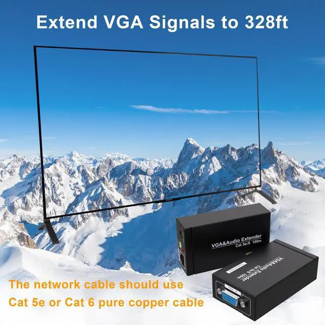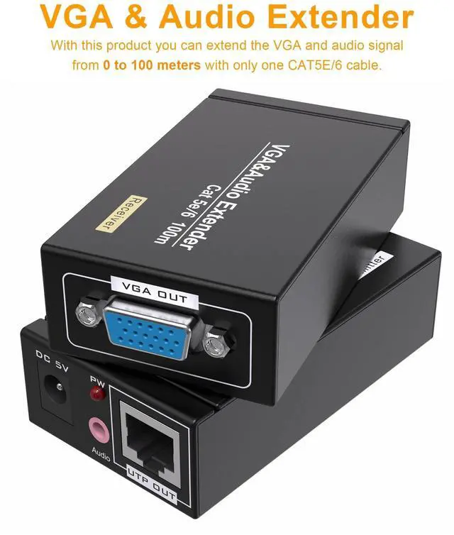 MOERISICAL VGA Over Cat5/ Cat5e/ Cat6 Extender with Audio Signal 328ft/ 100m by CAT-5e/ 6 cable Transmitter which is linked with main engine will convert the VGA signal to standard TCP / IP and transmit by internet. vga over ethernet Receiver which is connected with the display will convert the standard TCP / IP signal into VGA signal. vga to cat6 extender