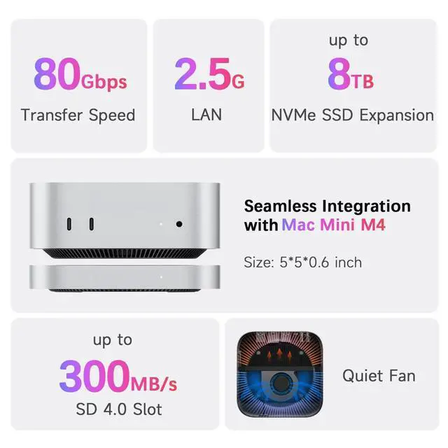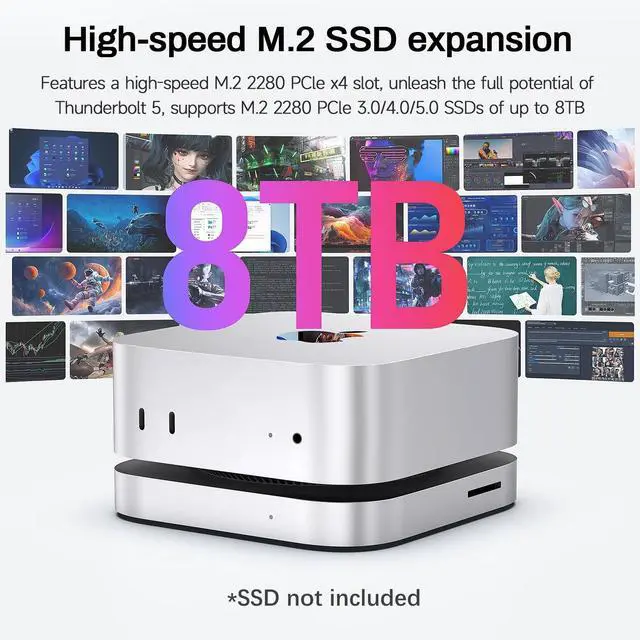 Expandable Storage: BEELINK EX Mate Mini features a single M. 2 2280 PCIe slot, supporting SSDs up to 8TB. Compatible with PCIe 3.0 / 4.0 / 5.0 NVMe SSDs, and capable of up to 80Gbps transfer speeds (SSD not included). Ideal for storing large files, video editing, and backups while keeping your desk organized. ^^ Superspeed Data Transfer Up to 80Gbps Our Mac mini M4 dock supports new technology with up to 80Gbps bandwidth for ultra-fast data transfer ideal for high-performance drives and HDDs.