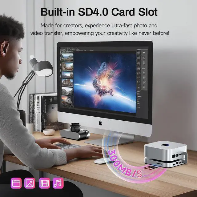 Mac Mini M4: This docking station is designed to be as thin as 16mm, which improves functionality while perfectly fitting the size of Mac mini. You can place it above or below the Mac Mini M4 through the connection cable to ensure stability, perfect for anyone using an Mac mini M4 or any mini PC, laptop, all-in-one, desktop computer with a USB 4 port.