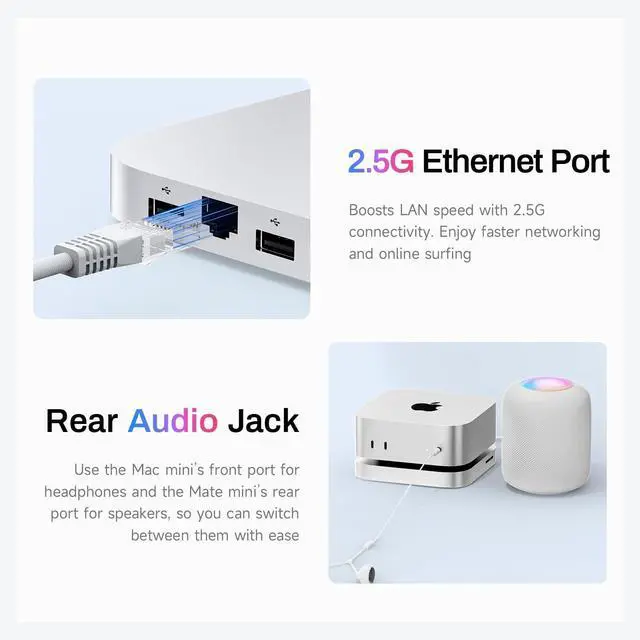 ^^ Multi-function PortsPorts: USB-C*1 (80Gbps), 2.5G LAN*1, SD 4.0 *1(300MB/s), Type-C(PD 3.0 )*1. The Mac Mini stand also provides USB A 3.0 *2 ports for connecting wireless keyboard and mouse. The laptop stand is equipped with two front and rear audio ports. The front port of Mac mini can be connected to headphones, and the rear port of Mate mini can be connected to speakers, so you can switch easily ^^ Designed for