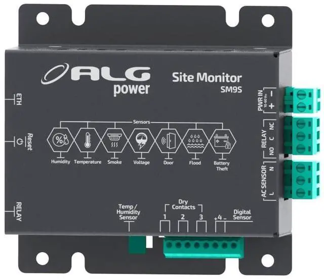 The Site Monitor is a monitoring and security module developed with the goal of providing accurate information via the Web server and SNMP-V2 protocol. The essential equipment for monitoring and securing data centers and POPs. Block Connector, 10 - 60 VDC RJ45 Connector, PoE 802.3 af WebServer and SNMP Protocol Monitoring of AC mains voltage Monitoring of DC power voltage Temperature monitoring (integrated sensor) Relative humidity monitoring (integrated sensor) Three inputs for dry contact sensors Input for digital sensor Programmable output with dry contact type for up to 5A