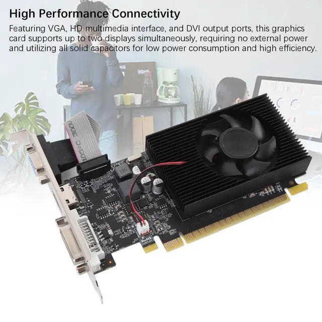 ^^ High Performance Connectivity: Featuring VGA, HD multimedia interface, and DVI output ports, this graphics card supports up to two displays simultaneously, requiring no external power and utilizing all solid capacitors for low power consumption and high efficiency. ^^