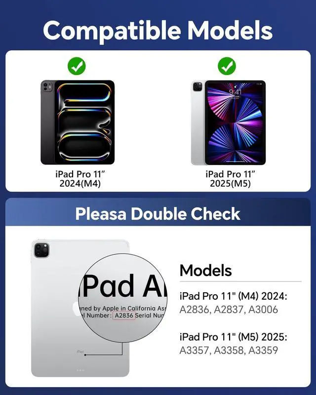 Precise Keyboard Case Compatibility This keyboard case is only compatible with the 2024 11-inch iPad Pro (M4 chip), corresponding to models A2836 and A2837. Please check the model number starting with "A" on the back of your device before purchasing. This also provides a smoother user experience with the iPad Pro 11 M4 keyboard case. ^^ iPad Pro 11 m4 Case with Keyboard Stand that Can Rotate 360 The bearing hinge design supports 360-degree rotation, allowing you to find the most comfortable viewing angle for your iPad keyboard case from any angle. ^^ Keyboard Case Suitable for Convenient Use in Multiple ScenariosWhether working from home, studying on campus, or traveling outdoors, this iPad Pro 11 Case with Keyboard can be used seamlessly.
