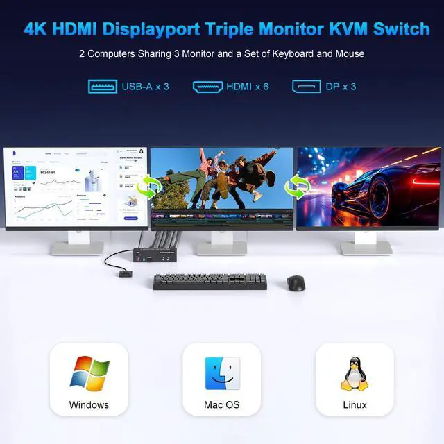 (Note: To achieve the highest resolution, you must ensure that both the source and the monitor, as well as the HDMI and DP cable, support 4K@60Hz) ^^ USB 3.0 3 Monitor KVM Switch +