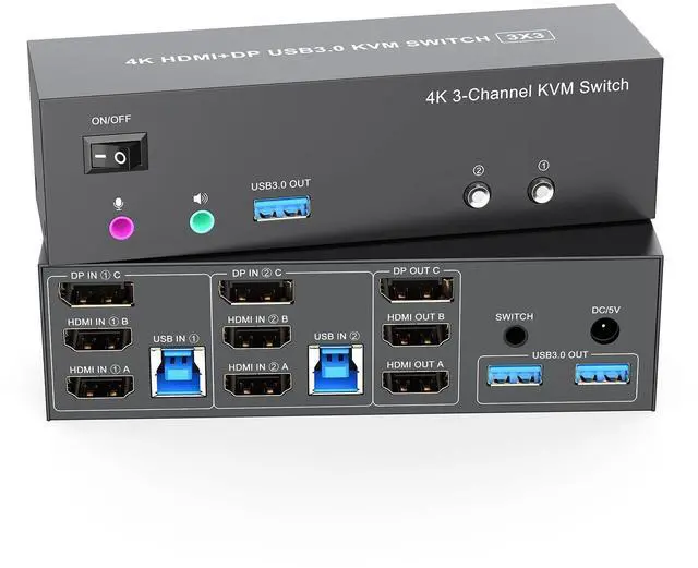 Power Switch: The kvm switch 3 monitors 2 computers display port is powered by USB cables, and the upgraded 5V power adapter makes the 4K 3 monitor 2 computer kvm switch work smoother and provides more stable recognition when connecting high-power USB devices. When not in use, just turn off the hdmi displayport kvm switch without unplugging the cables. ^^ What will you