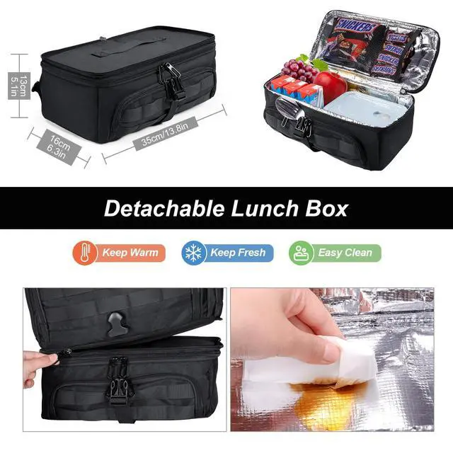 REMOVABLE COOLER LUNCH BOX: Measuring 13.8 * 6.3 * 5.1 inch in dimensions, it will fit max 10pc drinks or 2 food containers; Outside pocket perfet for knife, fork and spoon. With portable top handle, it can also be used as lunch bag.