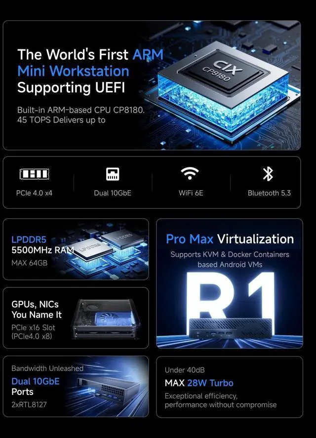 ARM Processor PerformanceThe MINISFORUM MS-R1 Mini Workstation is powered by the CIX CP8180, a brand-new ARM chip from a newcomer aiming to bring ARM performance and expandability closer to x86 levels. With 12 cores / 12 threads at 2.6GH z, 28W TDP, and 45 TOPS AI compute, including 28.8 TOPS NPU, it empowers AI inference, edge computing, and next-gen ARM applications. ^^ Support UEFI BootMINISFORUM MS-R1, the worlds first ARM mini workstation with UEFI Boot, enabling high-parallel virtualization in Proxmox and KVM environments. The MS-R1 is a truly plug-and-play ARM PCsimply write the ISO to a USB drive, install, and boot directly.