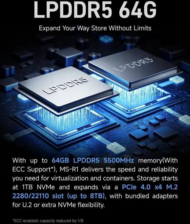 It is an ideal platform for classroom teaching and laboratory research. ^^ Dual 10GbE LAN+WiFi 6E+Bluetooth 5.3T his Workstation is equipped with dual 10GbE ports, the enterprise-grade wired performance for high-speed data transfer, routing, and network-intensive tasks. Wi-Fi 6E + Bluetooth 5.3 can provide Rock-solid wireless connectivity for ultra-low-latency collaboration and seamless home/office network integration. ^^ LPDDR5 ECC SupportedMS-R1 Mini Workstation is deeply optimized for containerized and Docker-based Android VMs, supporting up to 64GB of ECC LPDDR5 memory with a maximum frequency of 5500MHz (when ECC is enabled, the available memory capacity is reduced by approximately one-eighth).