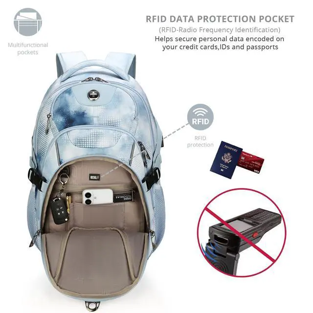 USB-C Charging System on the Go - Built-in mobile power pocket and USB-C cable let you charge devices directly from the backpack. Compatible with USB-C power banks (not included) for hassle-free charging during commutes or travel ^^ SAFEGUARD YOUR PRIVACY WITH AN INTEGRATED RFID PROTECTION POCKET: Travel without worries. The RFID protection compartment protects your personal data from being accessed by RFID scanners (e. g. credit cards, passports and drivers licenses) ^^
