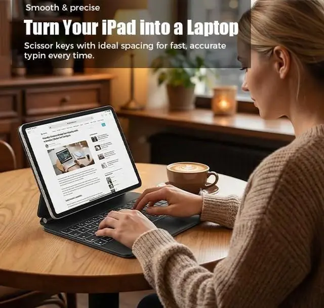 The keyboard case uses ultra-strong magnets to securely connect the tablet and case, effortlessly adjusting the floating stand to the ideal angle for typing or browsing. This transforms your iPad into a powerful laptop in seconds. The slim, lightweight design fits seamlessly with your iPad Pro 11 and Air 11 (M2 M3) and is ideal for work, study, or travel.