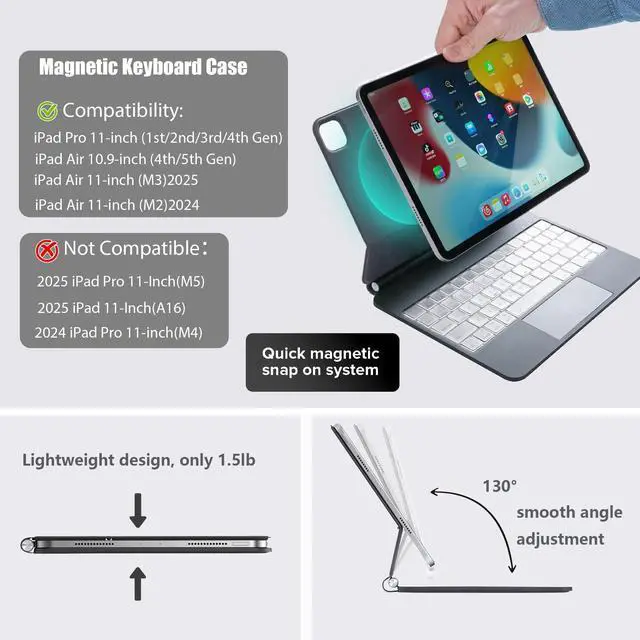 COMPATIBILITY - The Magic Keyboard works with iPad Air 11-inch 2025 M3 ( A3267, A3270,A3266), 2024 M2 iPad Air 11-inch (A2903, A2904, A2902), 2022 iPad pro 11 inch 4th gen (A2435, A2759, A2761, A2762), 2021 iPad pro 11 inch 3rd gen (A2377, A2301, A2459, A2460), 2020 iPad pro 11 inch 2nd gen(A2228, A2068, A2231), 2018 iPad pro 11 inch 1st gen (A1980, A2013, A1934, A1979), 2022 iPad air 5th gen (A2588, A2589, A2591), 2020 iPad air 4th gen (A2324, A2325,A2072, A2316). Please check the model number ("Axxxx") on the back of your iPad before purchasing to ensure compatibility.