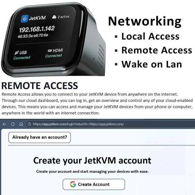 Jet KVM: Built-in VPN protects private workflows; JetKVM KVM over IP Cloud (WebRTC/STUN/TURN) bypasses restrictive NAT for encrypted direct connections. 100% free cloud access, ideal for remote workers/travelers. ^^ Ultra-Low Latency KVM over