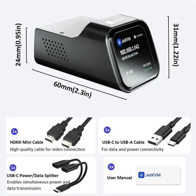 Open-Source JetKVM Flexibility: Linux/Golang-based system fully customizable via SSH. Full source code available, with RJ11 port for hardware expansion-adapts to diverse remote access needs, trusted by pros & home labs. ^^ ATX Power Control manages PC power states (USB-C/5V power, PCIe bracket for clean cable routing, dual pin headers). DC Power Control supports 12-20V DC devices (mini PCs/NAS) with 5.52. 5/ 2.1 mm adapters. Extension Power Control sold separately. See our store for details.