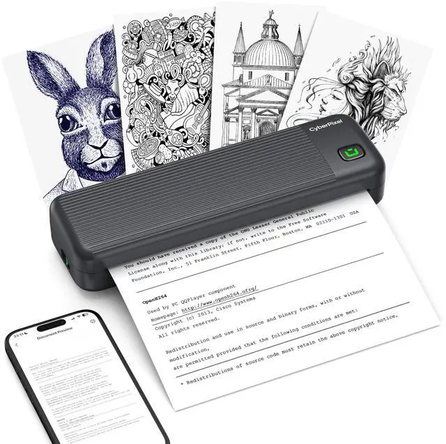 Enjoy fast, stable print for both home and office use. ^^ [Powerful 2550mAh Battery & Auto Power-Saving] This CyberPixel Bluetooth thermal Printer could print up to 300 pages per charge (varies by usage) with the built-in 2550mAh long-lasting battery. Features auto sleep mode to conserve energy, ensuring reliability for office, outdoors, homes, or all-day work. ^^ [Portable & Durable Design] Weighing only 680g with a sleek and compact body, this mobile wireless printer fits effortlessly in bags for travel. The sleek and non-slip design protects against drops, making this Portable Wireless Printer ideal for busy professionals.