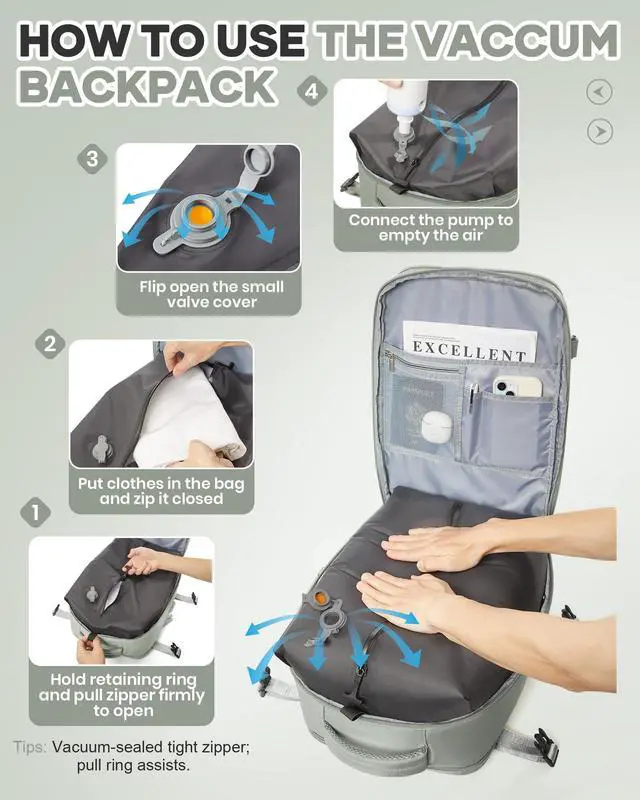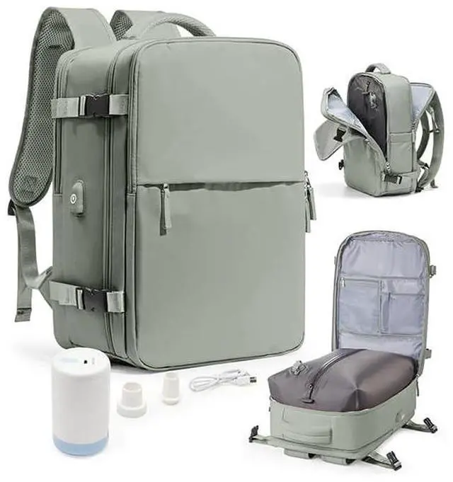 Fast Compression - FAST COMPRESSION - This backpack with AIR PUMP. compression system features bi-directional valve chambers for easy space savings. Use the included electric vacuum pump to quickly compress items (or simply press manually to release air) and also inflate items. Enjoy optimized storage space and minimize wasted luggage space. ^^ Waterproof & Durable - Featuring a water-resistant nylon exterior and a fully waterproof interior vacuum-sealed compartment, the bag keeps its contents dry even in heavy rain. Pressure-reducing shoulder straps and a breathable back pad ensure all-day comfort. ^^ USB Charging On-The-Go - USB charging port lets you power devices without opening the backpack - simply connect your power bank to the internal cable (power bank not included).