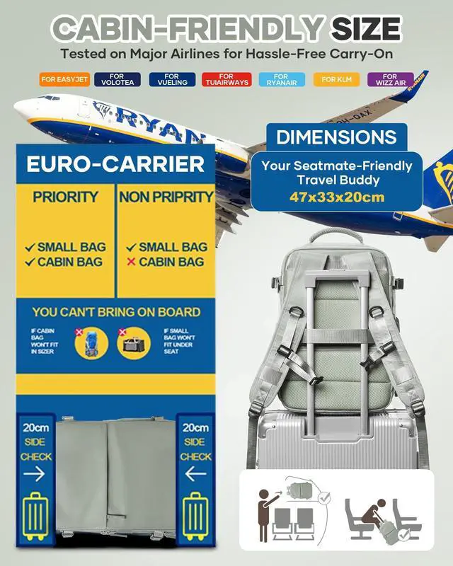 The scratch-resistant port cover maintains weather resistance while providing instant access to charge phones/tablets during travel, hiking, or daily commutes. ^^ Multi-Functional for Any Scenario - Perfect for travel, gym, or daily use! Features a main compression compartment + front accessory pocket + dedicated shoe compartment to keep clothes and essentials neatly organized. ^^ Airline Approved Backpack - Save on check-in fees by meeting major airline carry-on baggage size standards. Reduces the risk of lost luggage. The back can be snapped on to the trolley handle to create an integrated mobility solution, allowing you to travel through airports with ease.