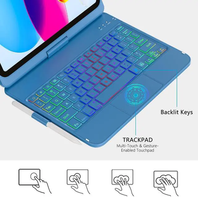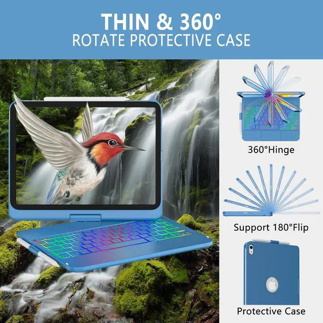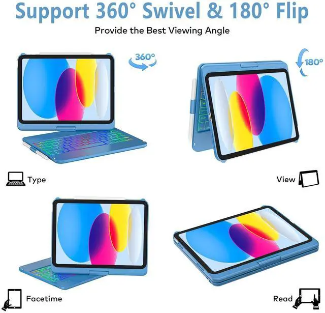 Colors Backlit Keyboard: This for iPad A16 keyboard case is designed with laser-etched backlit keys that allow 7 vibrant colors to shine in the dark, illuminated typing is more fun and easy. You can choose your favorite color, bringing you different visual enjoyment. ^^ Free Rotation Design & Pencil HolderDesigned with a 360 free rotation hinge, you have maximum freedom when using it, offering infinite viewing angle. You can also easily flip the keyboard case for ipad 10th generation from 0 to 180 degrees, allowing you to freely adjust the tilt angle and use it in multiple positions. At the same time, for ipad 10th generation case with keyboard comes with a special pencil holder compatible with apple ipad stylus for a more compact design. ^^ Auto Sleep/ Wake Function & Energy SavingEquipped with ipad keyboard auto hibernation, auto/sleep wake initiates when keyboard case for ipad 10th generation is opened & closed to conserve battery life. The ipad 10th generation keyboard will enter sleep mode if it is not working for a long time, and you only need to press any key to reconnect.